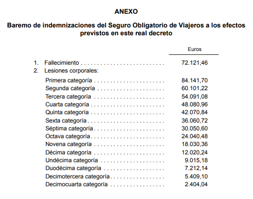 En el Anexo de la Ley se establece el Baremo de Indemnizaciones del Seguro Obligatorio de Viajeros, que divide en Fallecimiento y categorías de lesiones (se remite al RD 1575/1989). En caso de fallecimiento y lesiones las indemnizaciones previstas en el Baremo son:Importes, que deben ser actualizados conforme al IPC desde el año de la entrada en vigor del texto normativo. En este caso, desde el año 2014 hasta la actualidad.